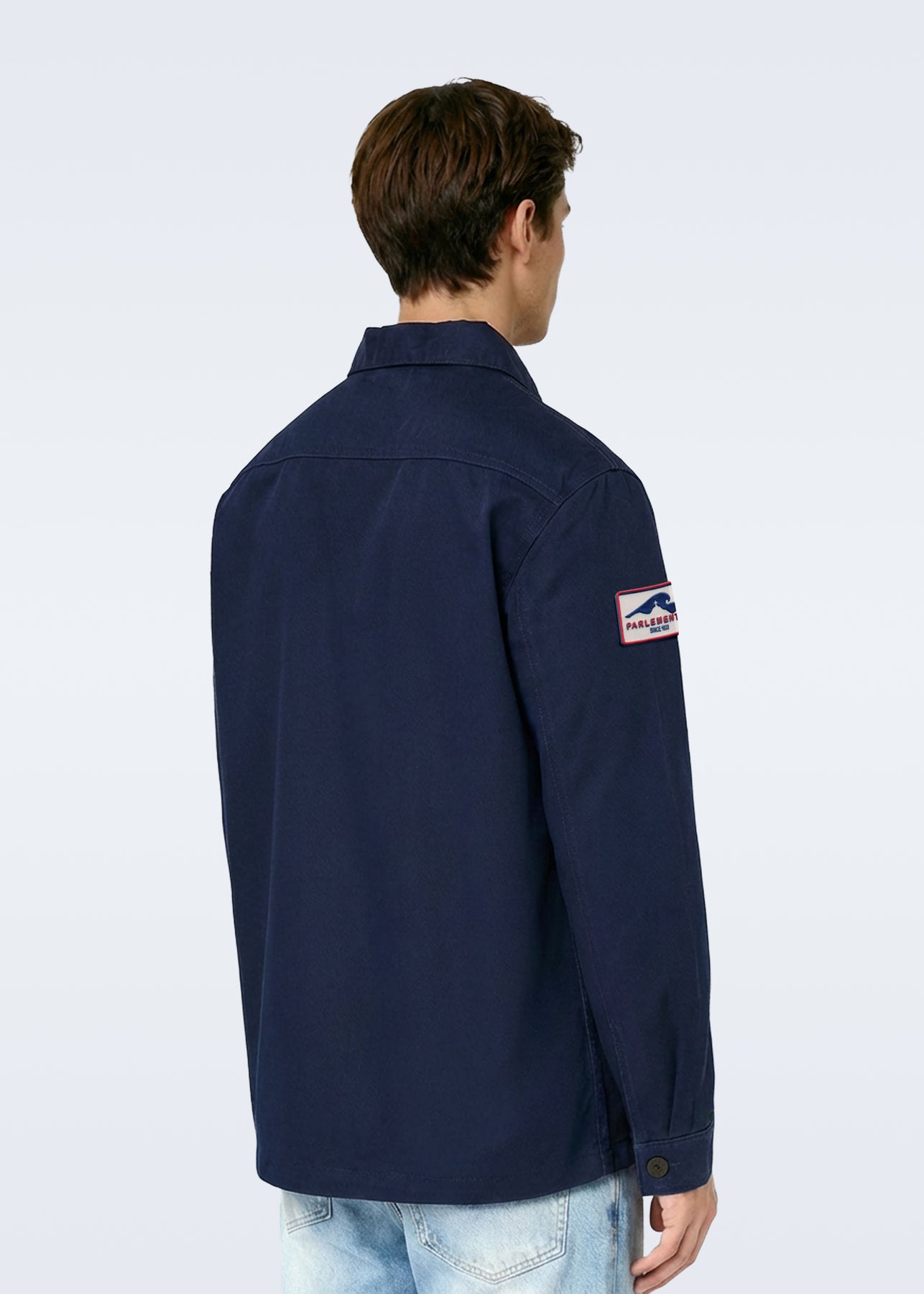 Devenue un classique de notre collection, la veste d'atelier unisexe avec son tissu twill au toucher effet peau de pêche en coton bio marine. Patch Parlementia Hill sur l'épaule et Parlementia Easysurf floqué en petit sur la poche gauche.