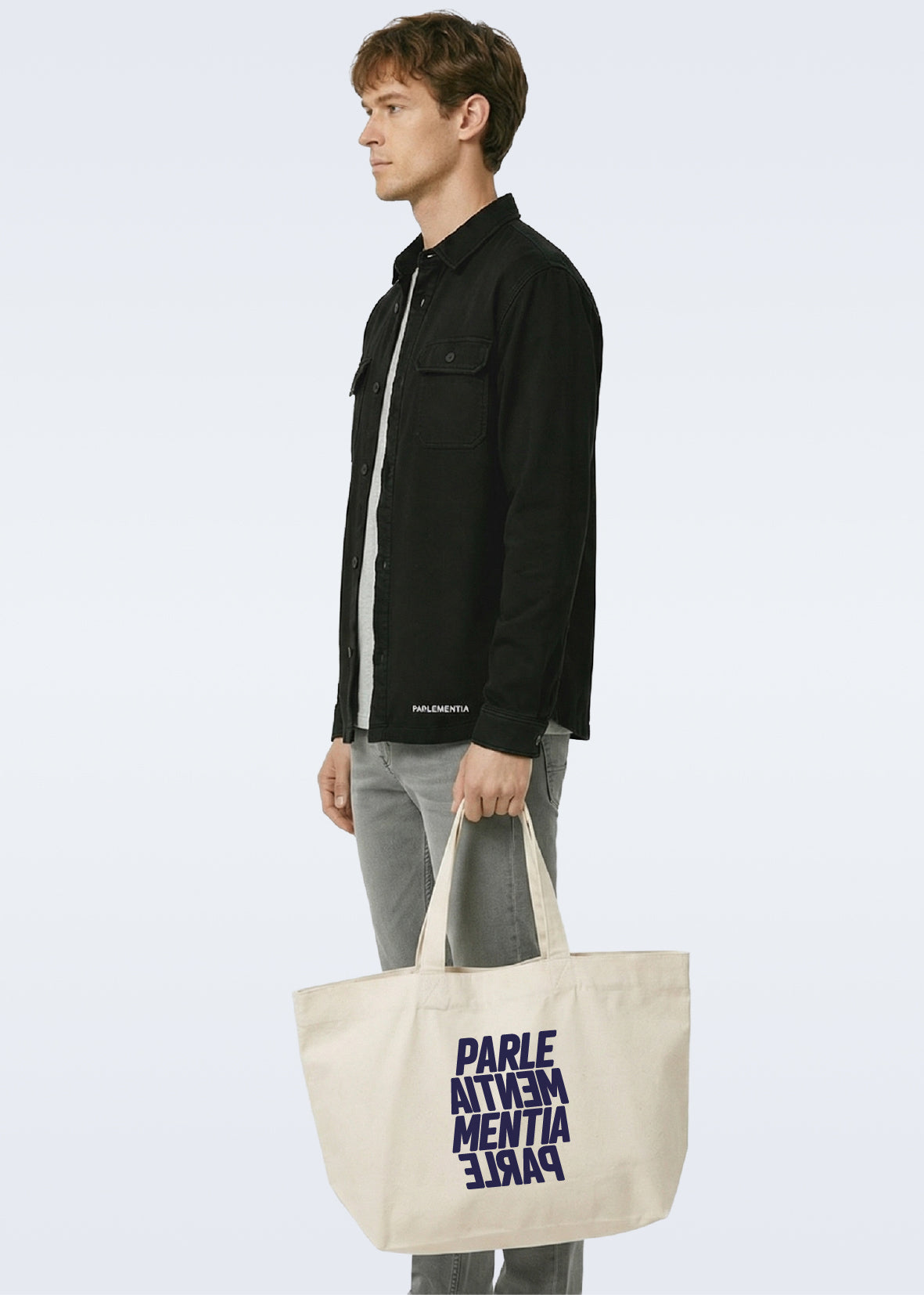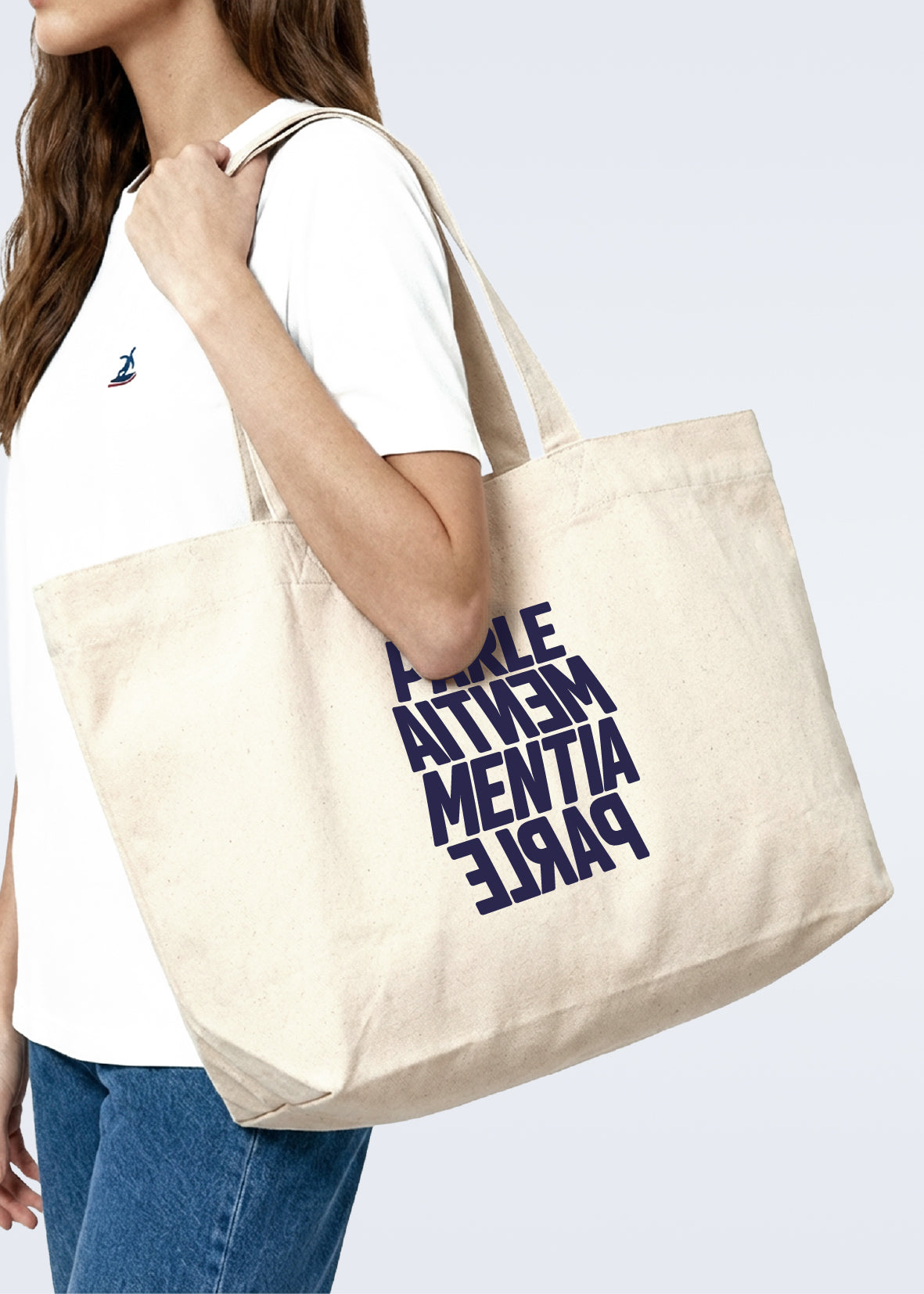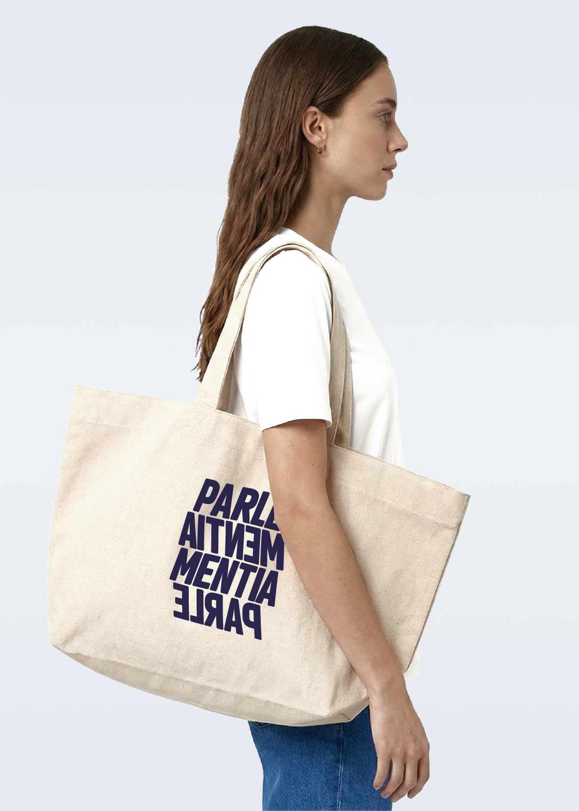 Le shopping bag de Parlementia, bien robuste avec sa toile naturelle tissé 100% coton recyclé natural. Floqué de notre logo Swell en marine.