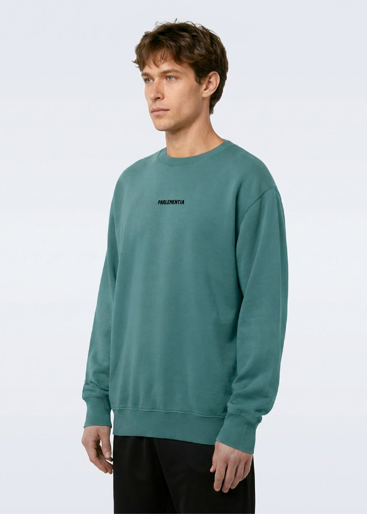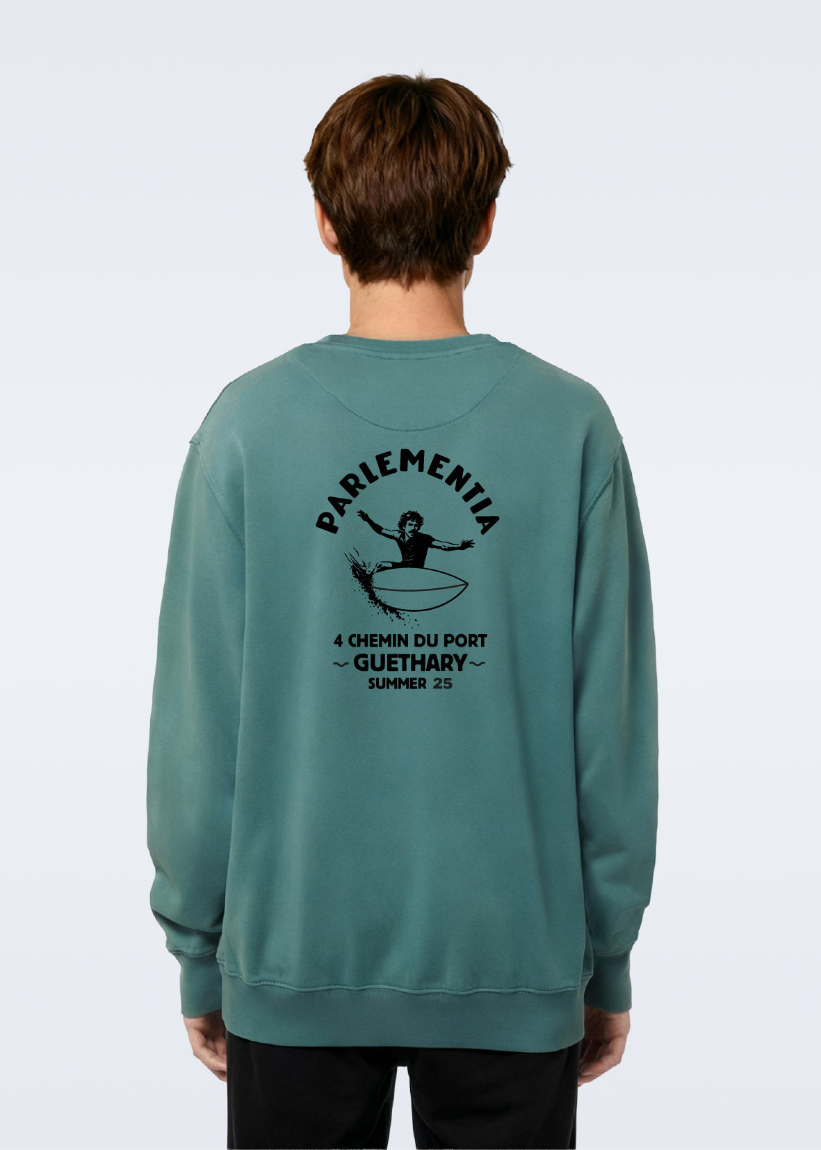 Prix régulier €90,00 Nice price €45,00 50%Sweatshirt unisexe en molleton non brossé vert usé de coton biologique. Avec notre logo Guéthary Summer 25 en noir floqué dans le dos et Parlementia sur le torse.