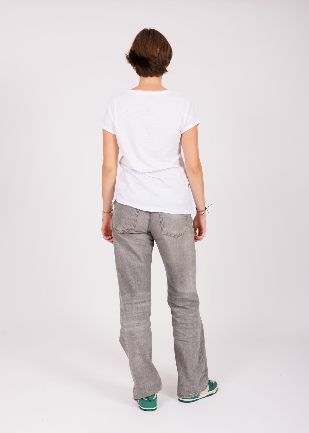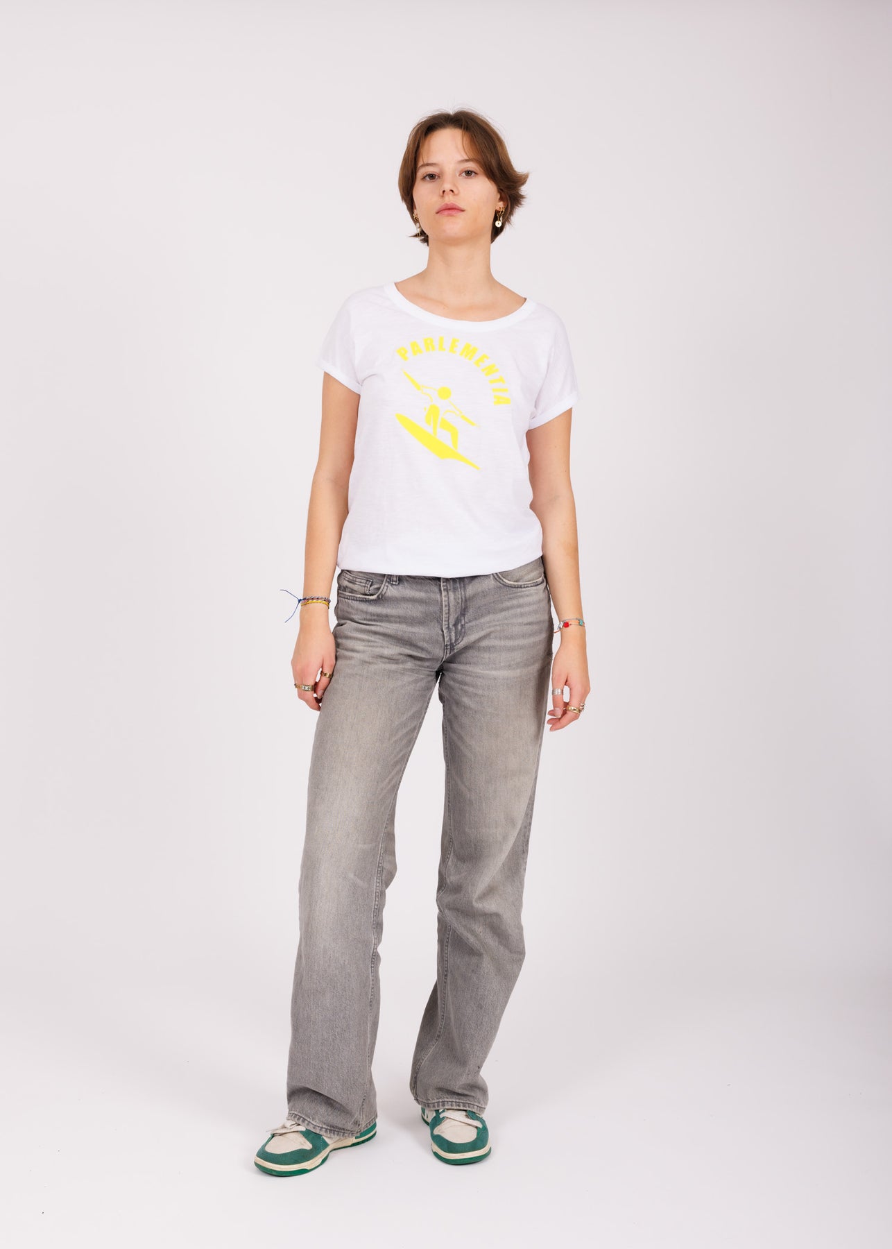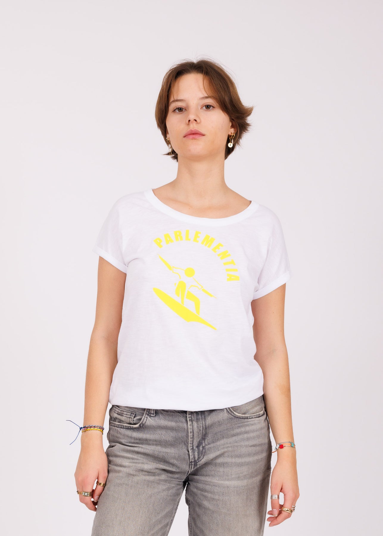 Le tee-shirt femme cool par excellence, en coton biologique, avec son col large et ses bords de manches repliés. Décoré dans notre atelier de Guéthary avec le logo Fingers jaune floqué sur la poitrine.