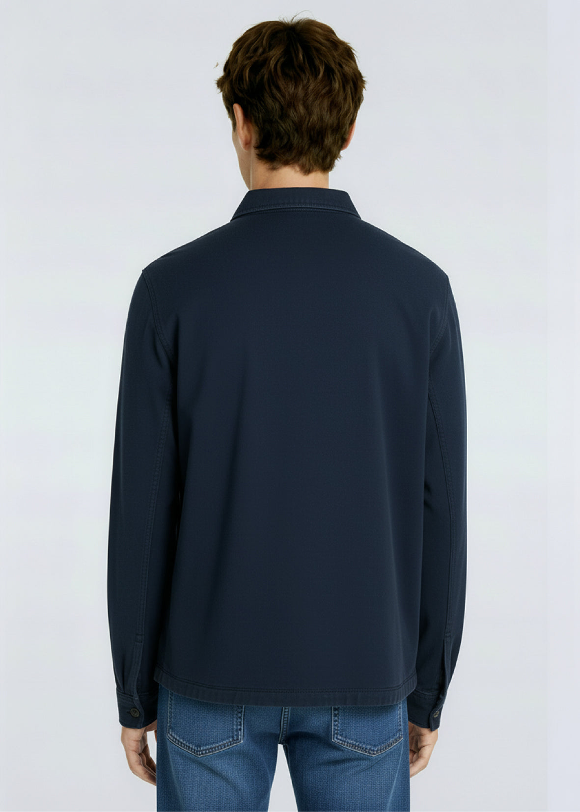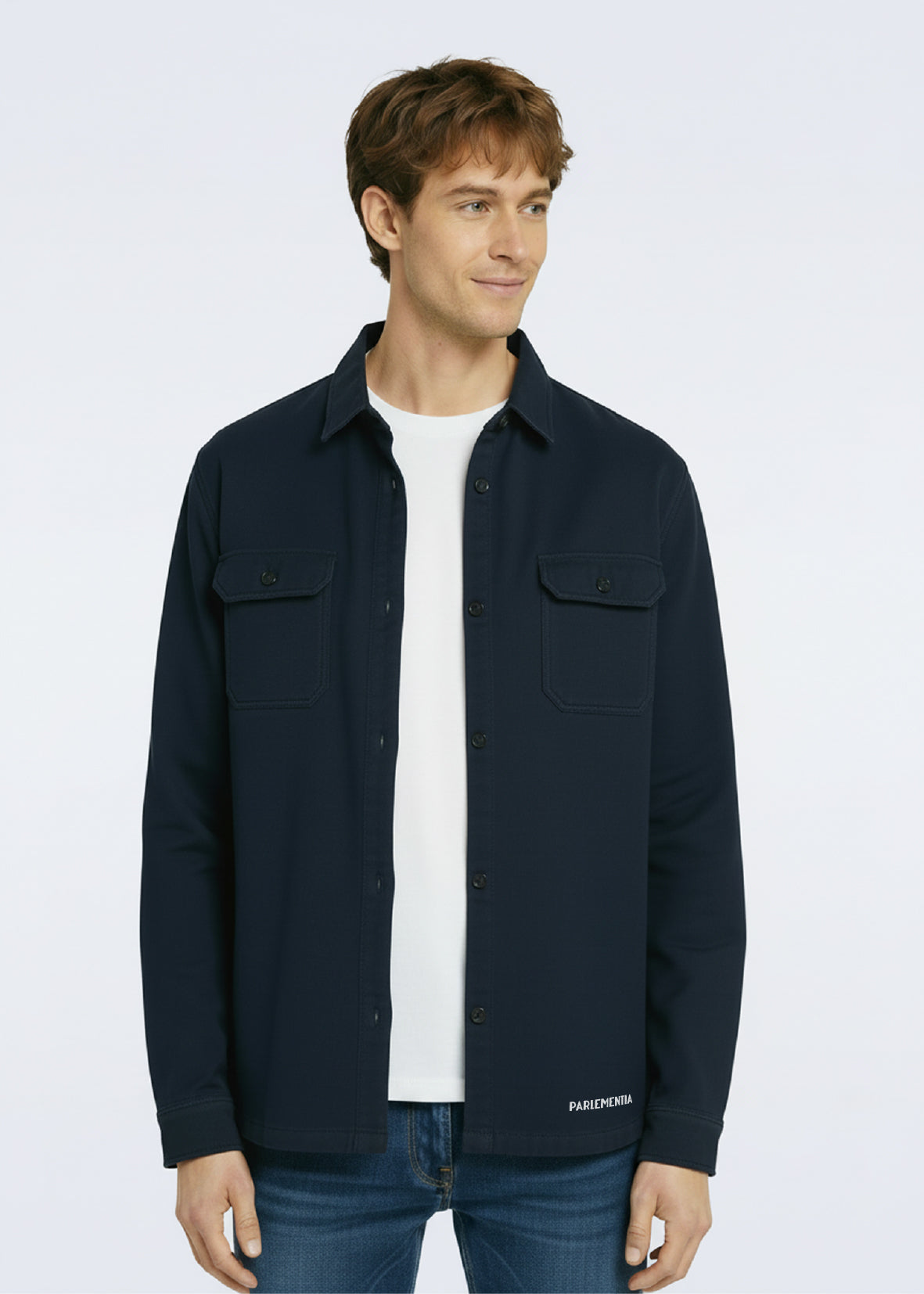 Surchemise écoresponsable délavée de coton biologique bleu marine pour homme et femme, floqué de notre écriture Parlementia en blanc sur le bas du vêtement.