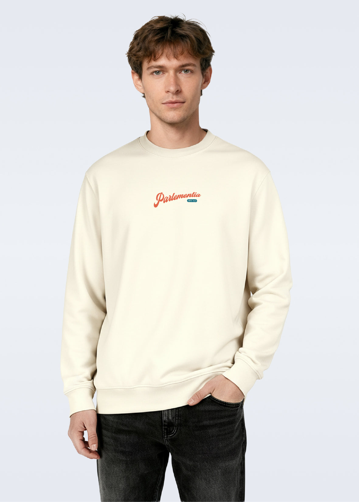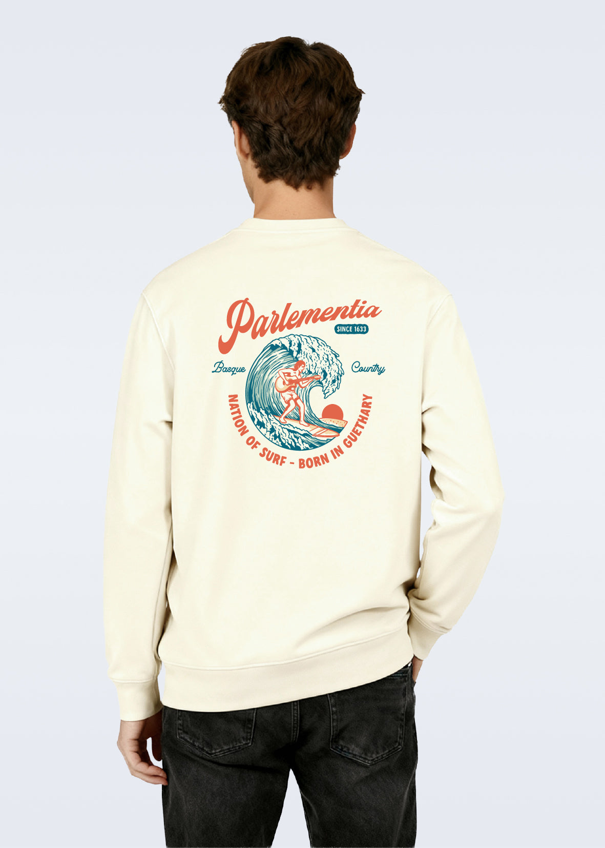 Sweatshirt unisexe en molleton non brossé naturel de coton biologique et polyester recyclé. Avec notre logo Surf Music en version multicolore dans le dos et Parlementia sur le torse.